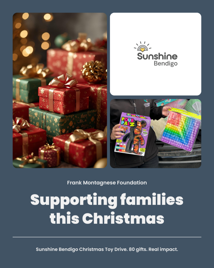 In the lead-up to Christmas, the Frank Montagnese Foundation partnered with Sunshine Bendigo to support its annual Christmas Toy Drive, funding the purchase of 80 gifts for local families.